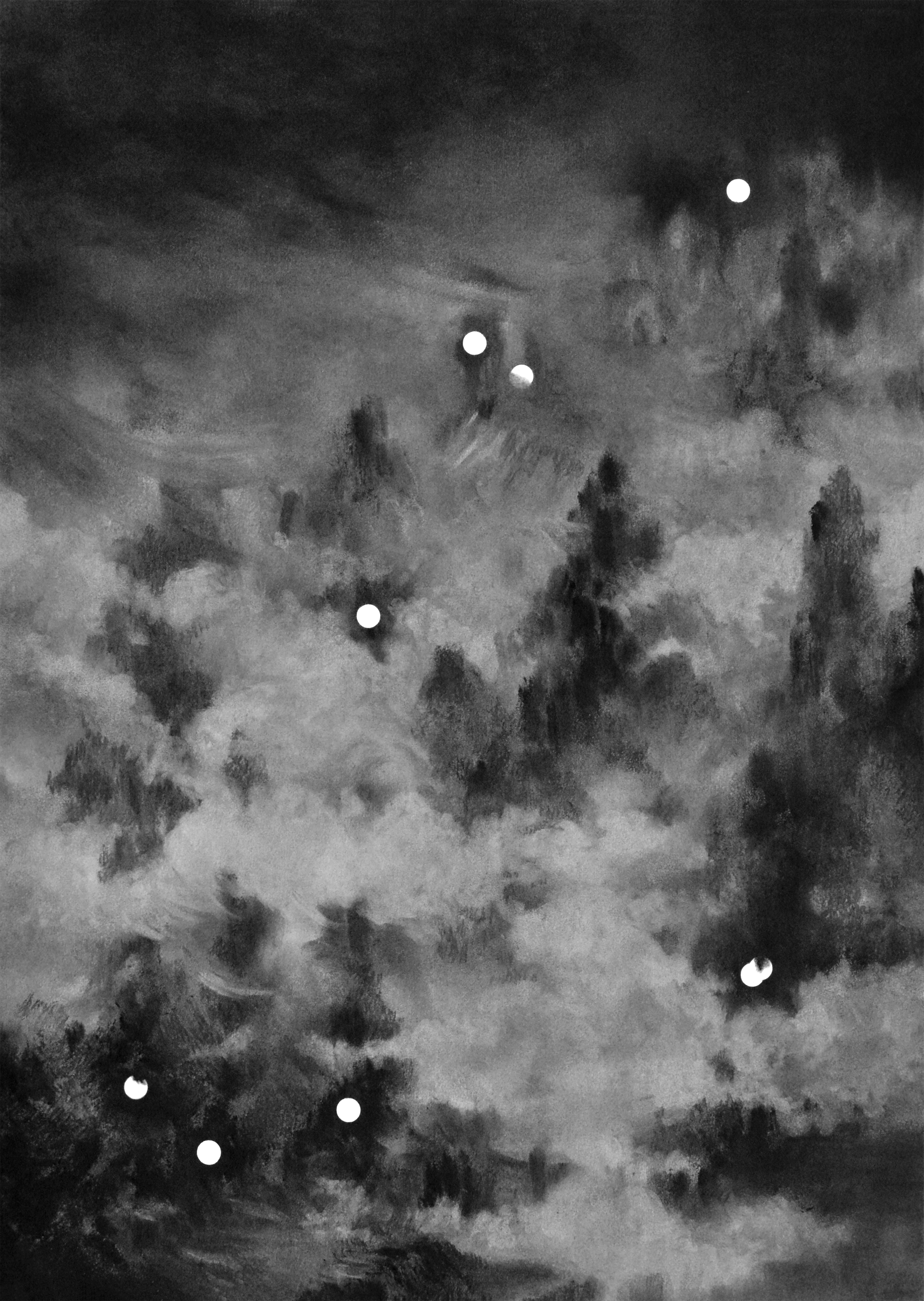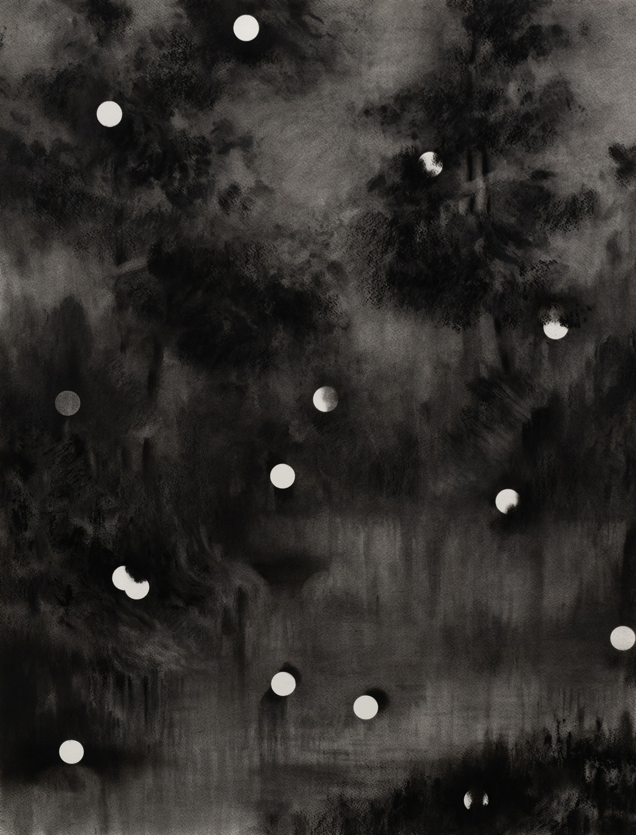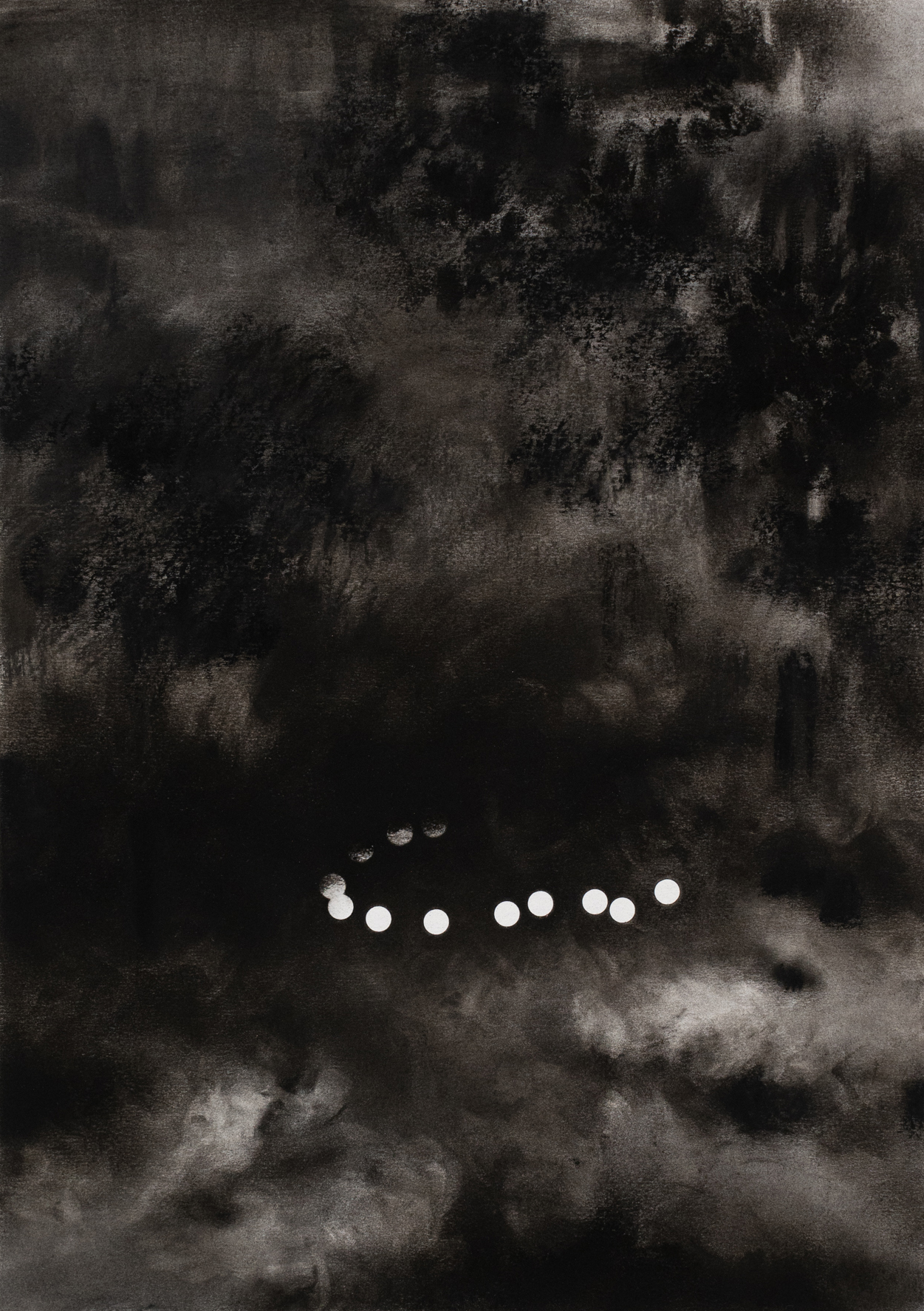 The process begins with a white sheet of paper and circular stickers of various sizes. I interact with the surface as if it were a space with depth, moving from what feels distant to what feels closer. As the image starts to reveal itself, the layers of charcoal gradually increase. When the stickers are removed—one of the final stages of the drawing—white circles appear, opening up the image through the illusion of partial concealment.
