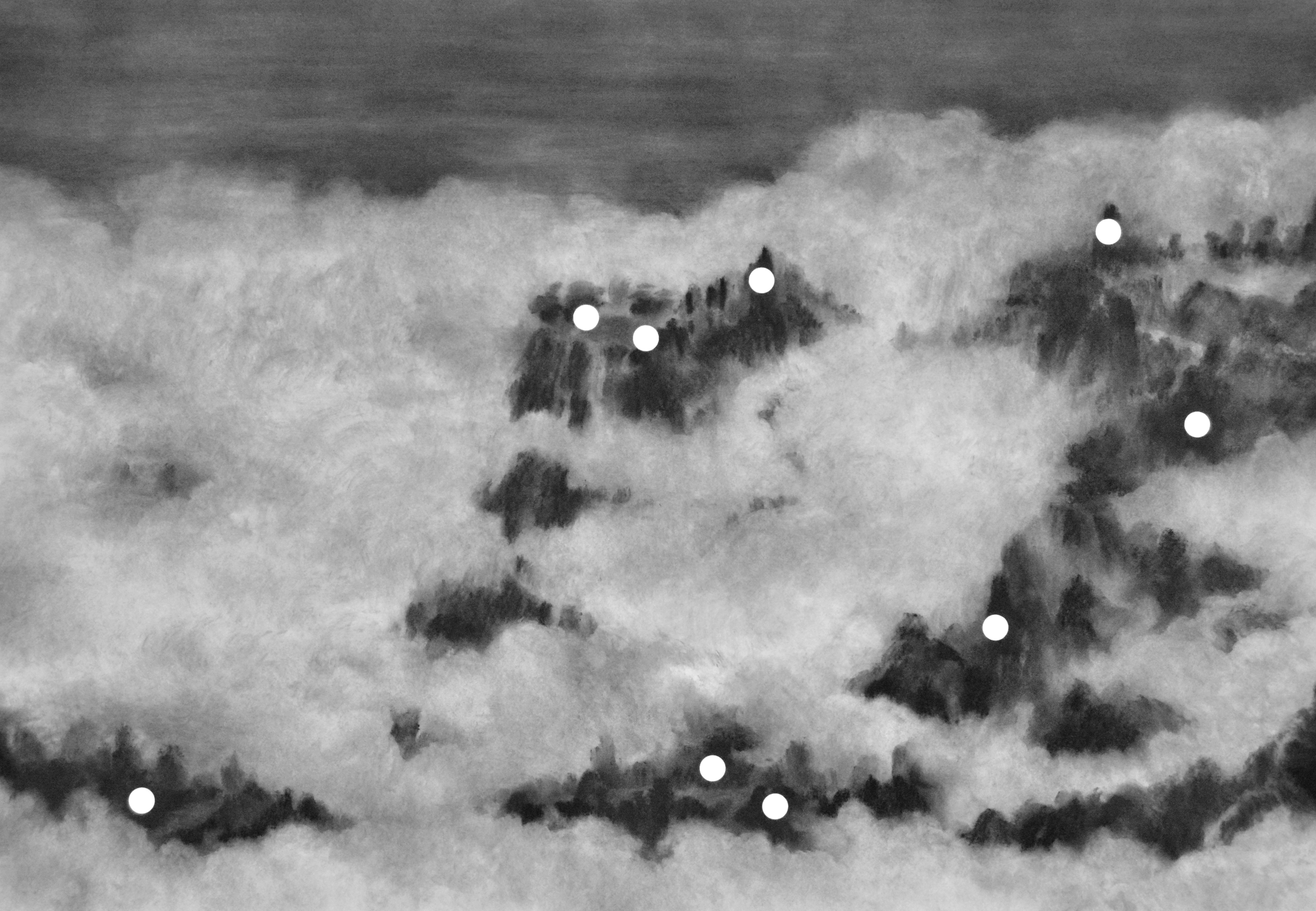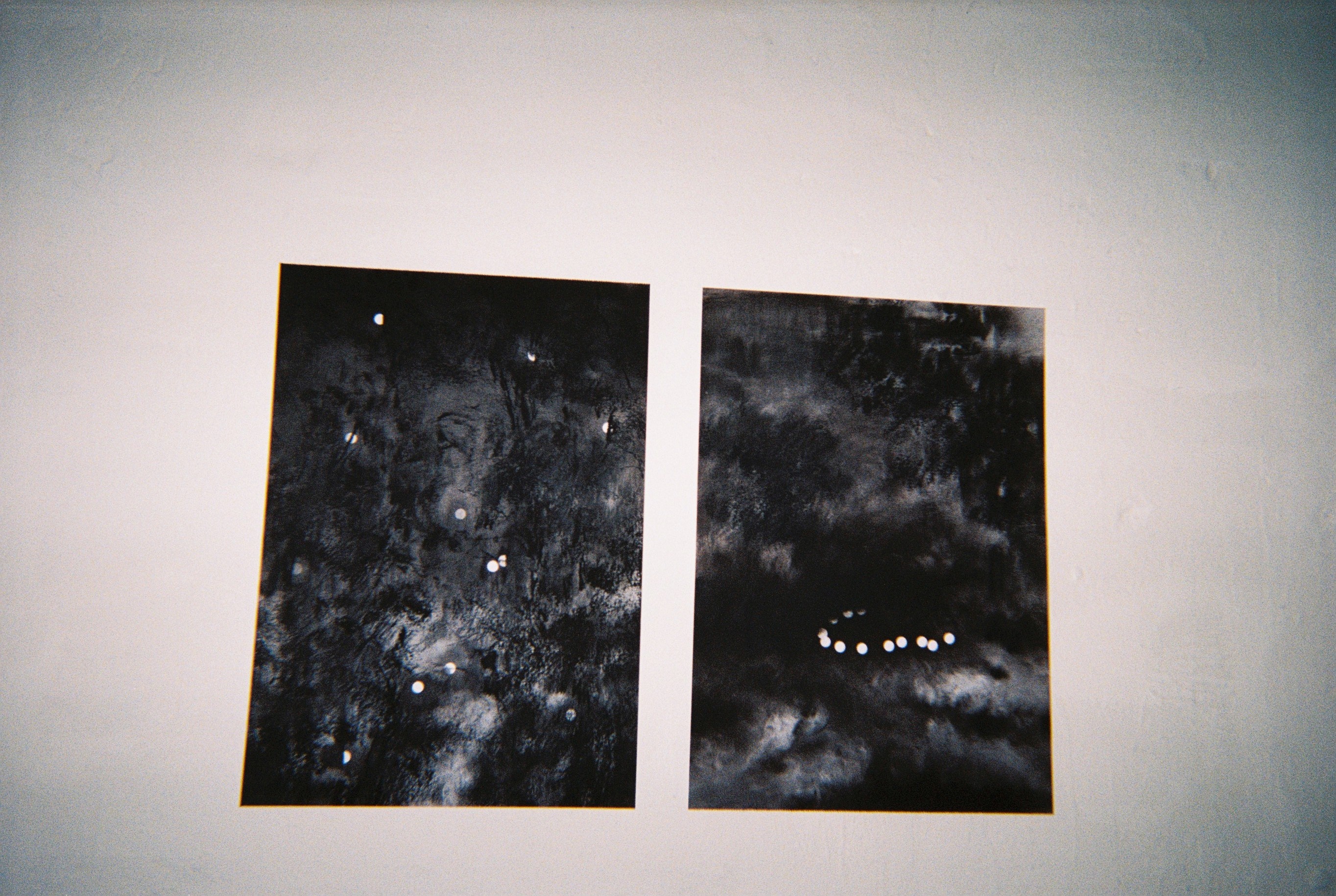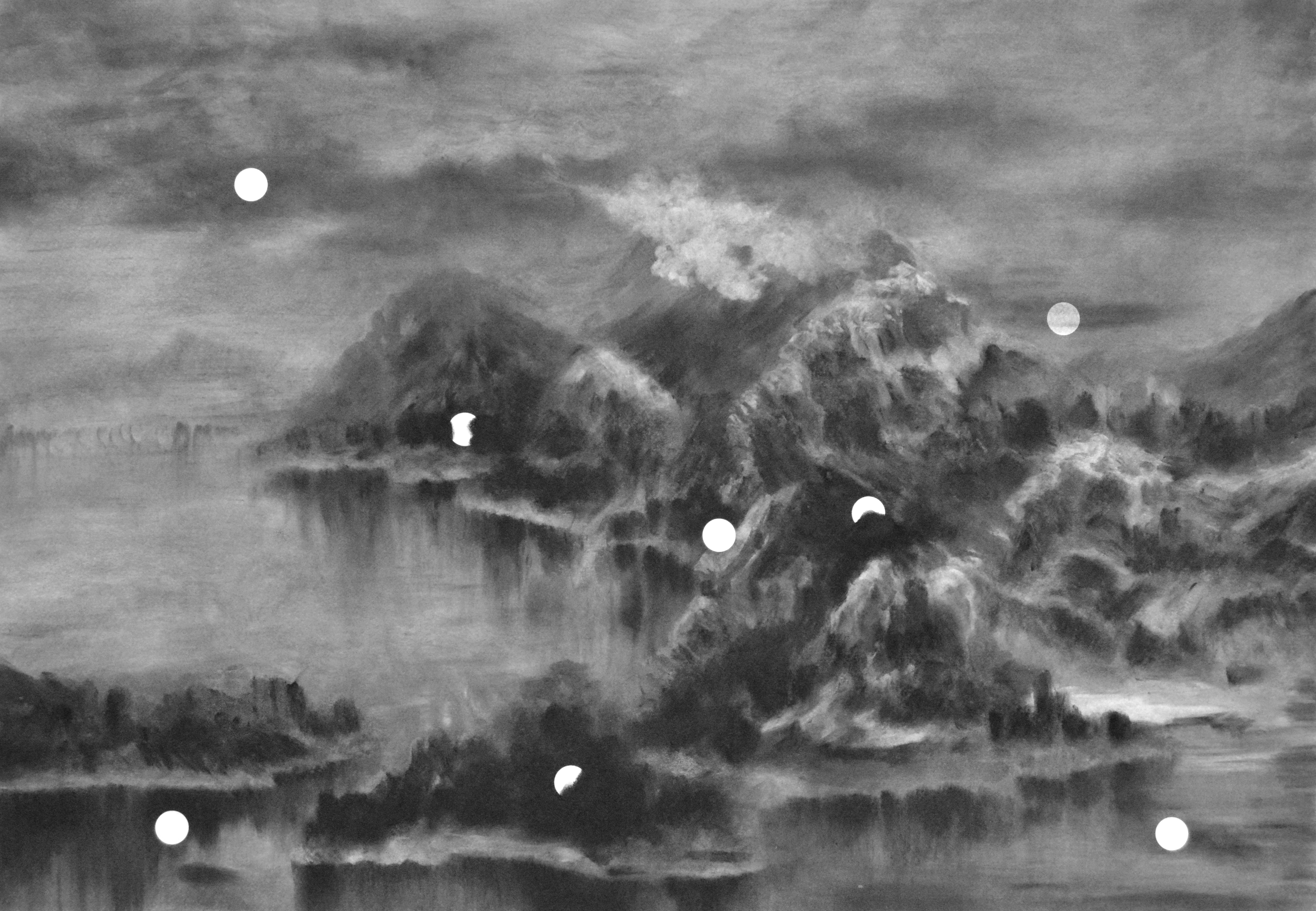 The process begins with a white sheet of paper and circular stickers of various sizes. I interact with the surface as if it were a space with depth, moving from what feels distant to what feels closer. As the image starts to reveal itself, the layers of charcoal gradually increase. When the stickers are removed—one of the final stages of the drawing—white circles appear, opening up the image through the illusion of partial concealment.