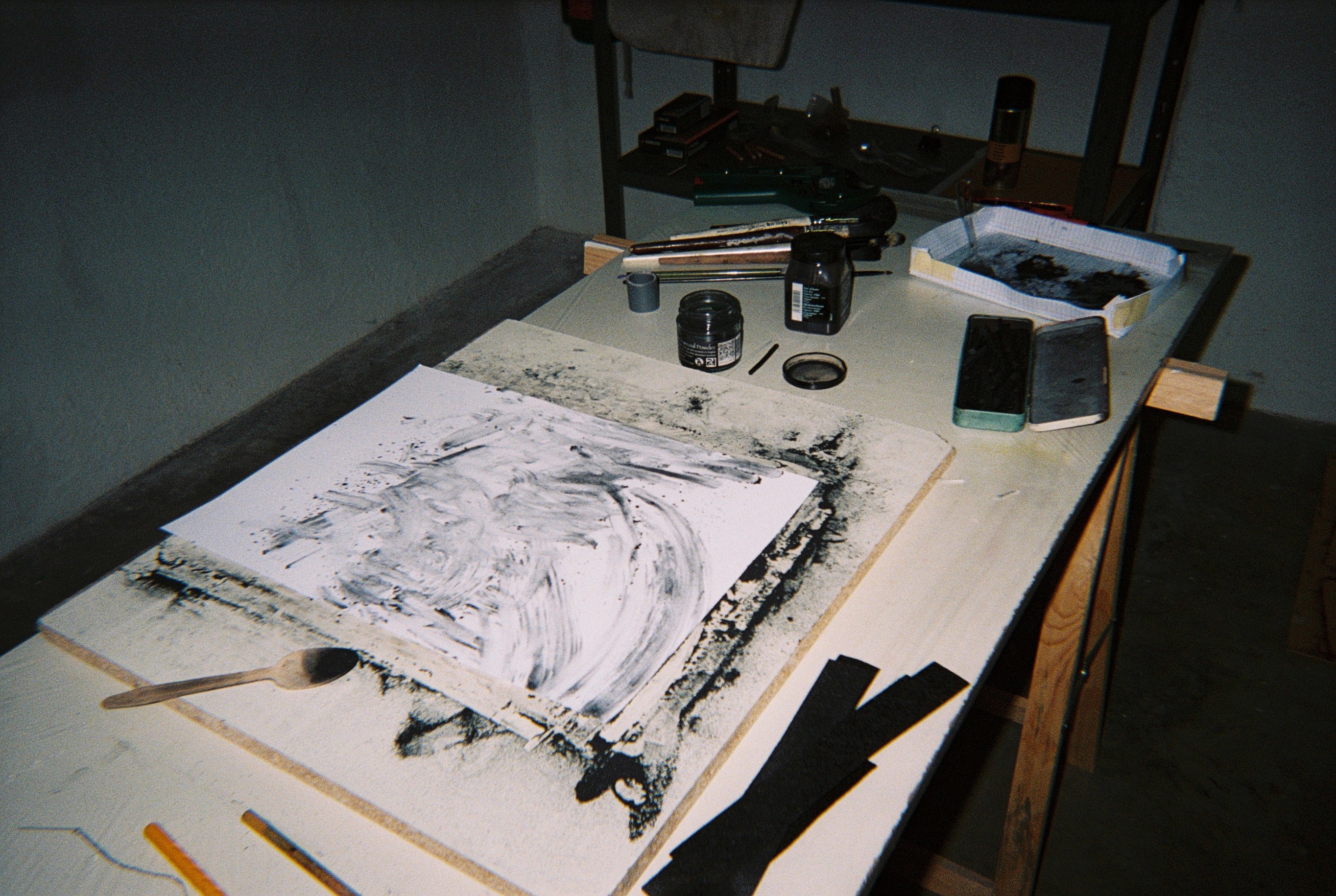 In drawing, which I usually do on the floor, there is a moment when I lift the paper and place it vertically to view it from a distance—often when I feel particularly drawn to do so. At that point, a significant amount of loose charcoal falls away. There is always a constant adjustment between the mark made and the material’s behaviour, between an image that has formed and one that is still emerging.