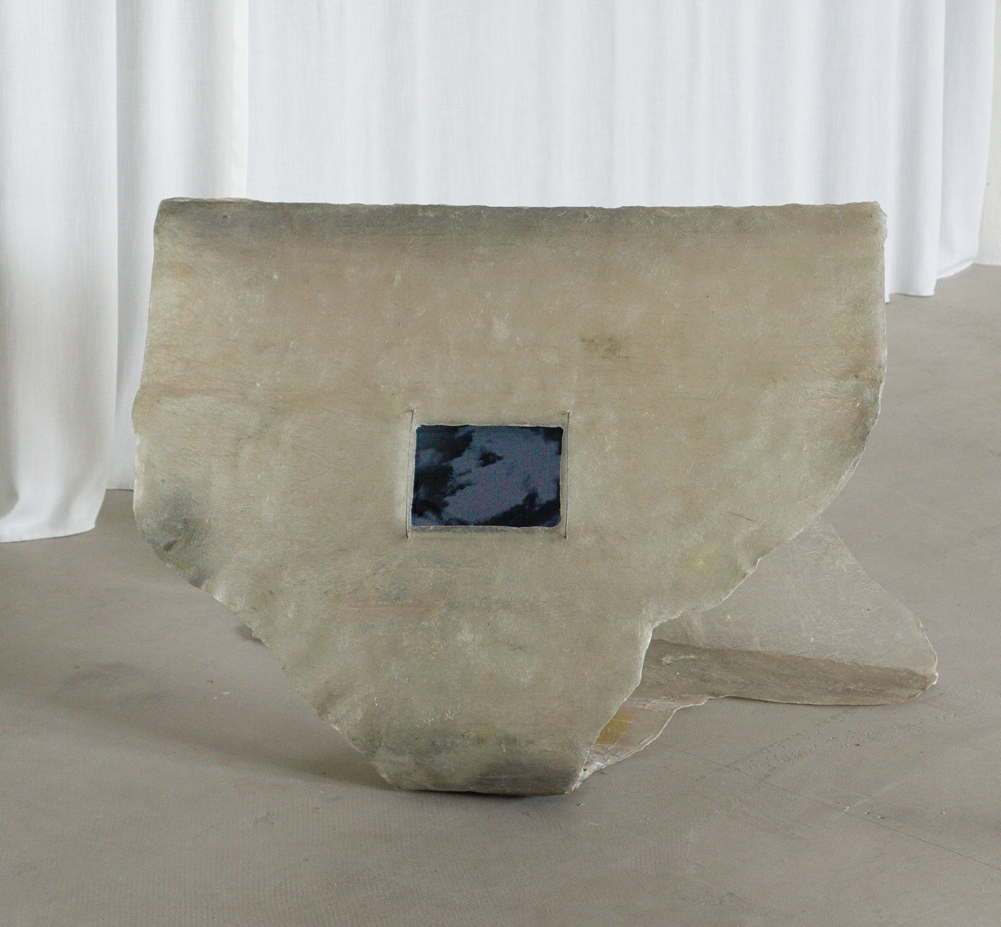 Naquele momento, os temas das esculturas giravam em torno de perceber como a modernidade se manifesta hoje, ao pensar quais são os seus fardos no estado contemporâneo em que vivemos. Desde então, venho trabalhando com três signos que escolhi para simbolizar a modernidade e seus ecos no presente: a fumaça, o fantasma e as nuvens. As esculturas nasciam como formas que aludiam a esses símbolos, mas nunca de maneira literal. São formas que transitam entre esses três elementos, uma vez que pretendem ser indefinidas, híbridas e ambíguas. Escolhi a fibra de vidro para dar corpo a essas ideias porque é um material extremamente industrial, pensado originalmente para usos técnicos. Porém, eu o trabalho de forma manual, artesanal, deixando visível tudo aquilo que se costuma esconder: a fibra de vidro como estrutura e a resina exposta, quase como se fosse um esqueleto à mostra. É um material agressivo, mas ao mesmo tempo translúcido, pois permite a passagem da luz, assim, contém essa dualidade entre solidez e transparência. Isso me ajudava a materializar criticamente esses símbolos, sempre num território dúbio, difícil de definir, quase incerto.