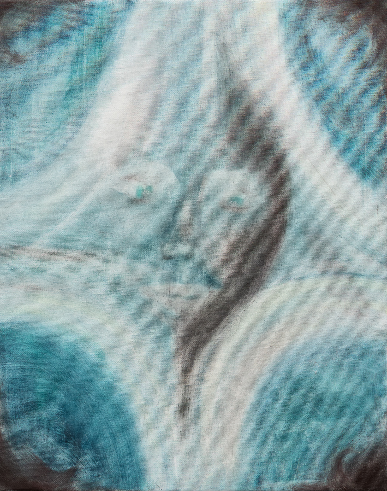 Uma referência que surgiu, e que é muito forte para mim, vem do cinema, de novo, Tarkovsky. Ele fez uma série de polaroides com uma paleta muito semelhante às cores que venho usando agora: verdes e azuis específicos, típicos do processo polaroide. Ele trabalhou essas tonalidades de modo muito marcante, inclusive nos seus filmes. Stalker, sobretudo, se move nesse território: um cinza-esverdeado que não é exatamente natural, parece até um verde contaminado, com um toque turquesa. Tenho usado esses tons nas minhas pinturas, embora essas referências muitas vezes não surjam de imediato, mas permaneçam no fundo da mente, até emergirem, inesperadamente, no processo criativo.