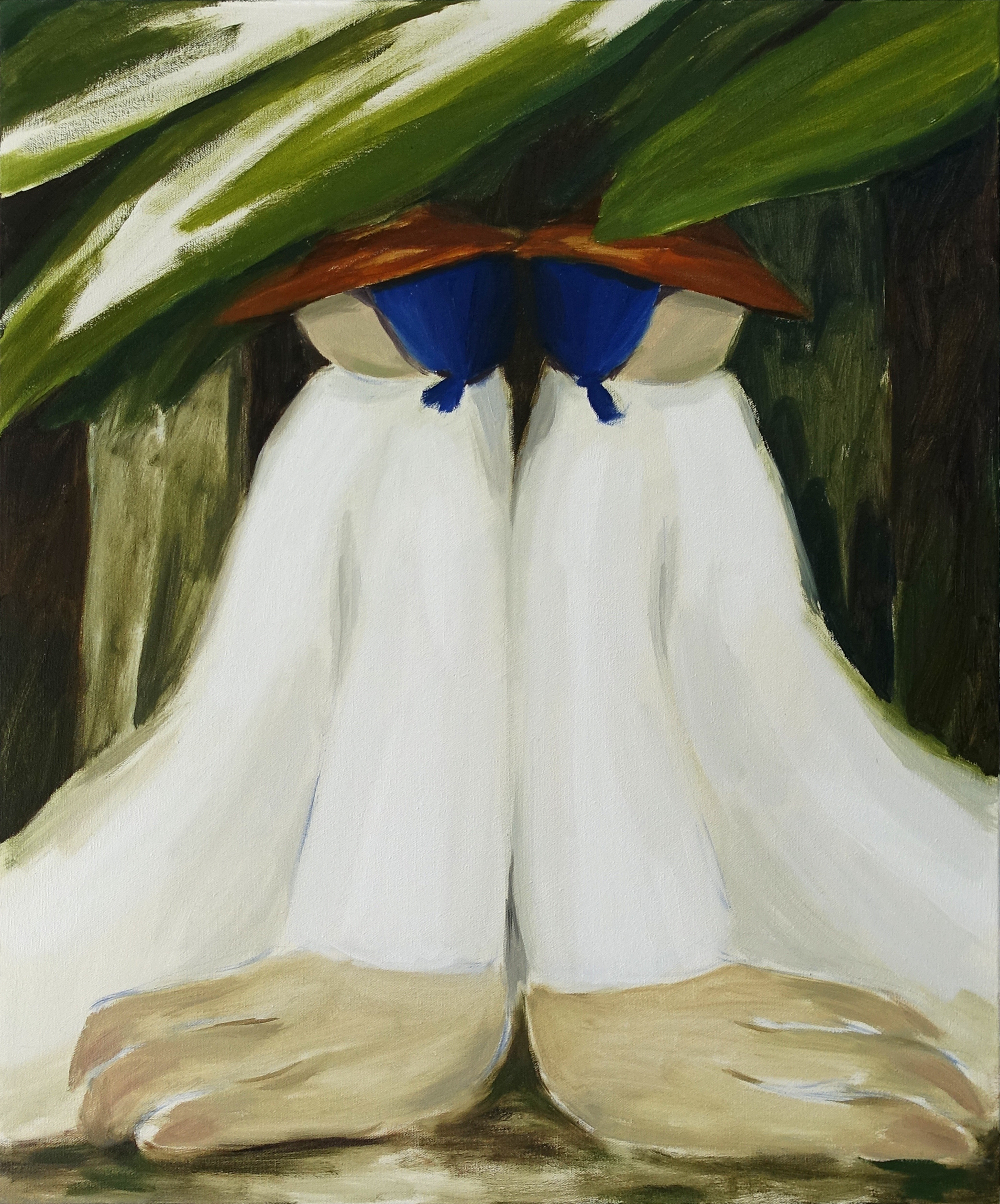 I like the coexistence of opposites: a big, strong figure next to a more delicate or beautiful image, for example. For me they’re almost utilitarian elements, in the sense that they activate the painting, they make something happen. They don’t have their own identity or specific traits, and I think that allows them to merge more easily with the pictorial environment, to integrate better into the composition. Maybe that’s why I’m drawn to blurring the distinction between a human body and a tree, for instance. They exist on the same level. In the end, for me, both are painting in that moment. I don’t need them to have a defined personality, because what I’m looking for is for them to be just one more element within the whole.
