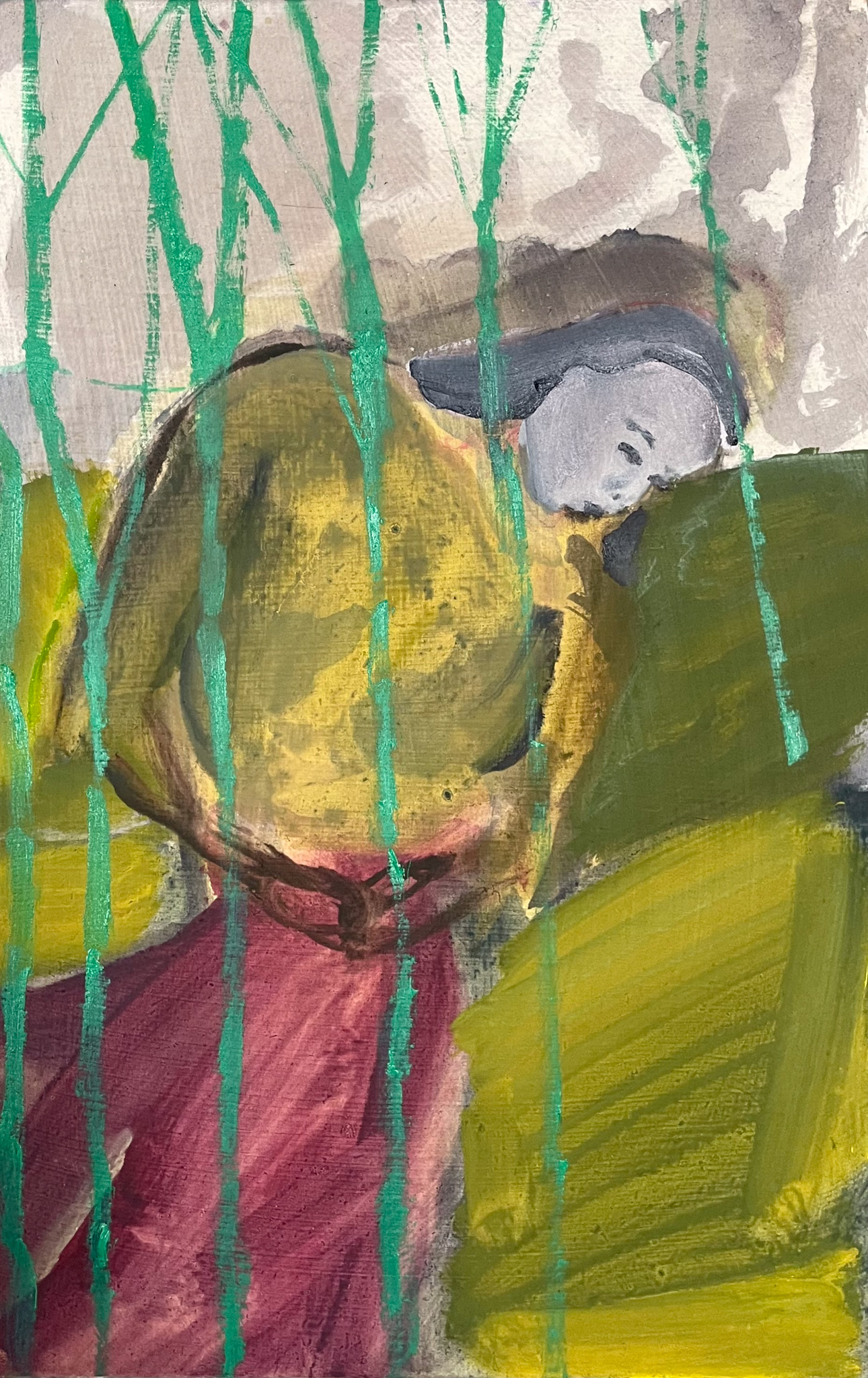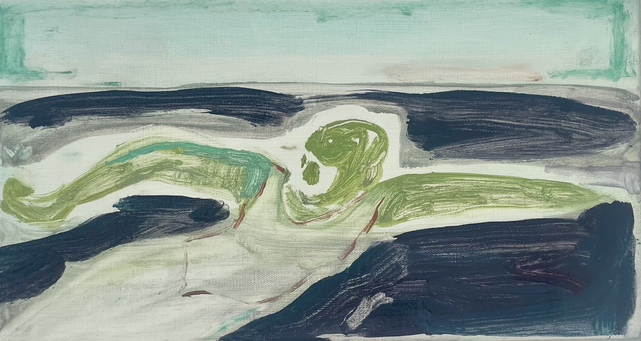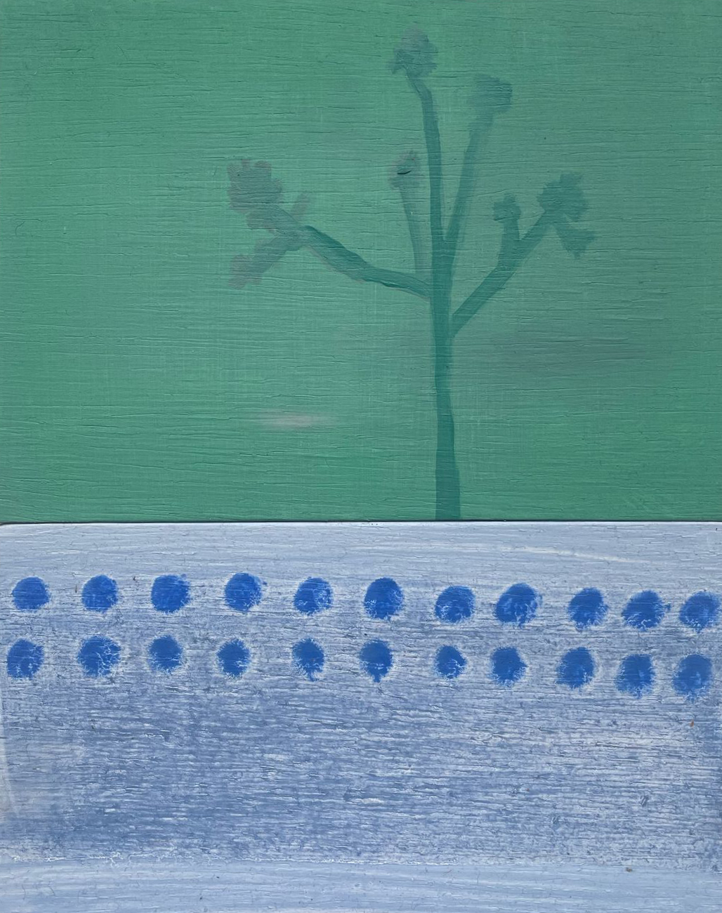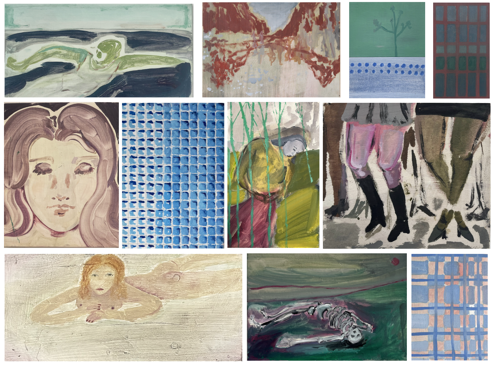 Yes, the small ones, I think, heal me a bit. They allow me to let go of control, which is something I think I need. There’s no pretension of creating a great work, or a big project. It may work or not. If it doesn’t, you flip it over and paint on the back, and that’s it. It allows me to loosen up and be present in the material, in the paint. That’s also why they have more texture, I think. Here, I don’t erase as much, and I also play more with color.