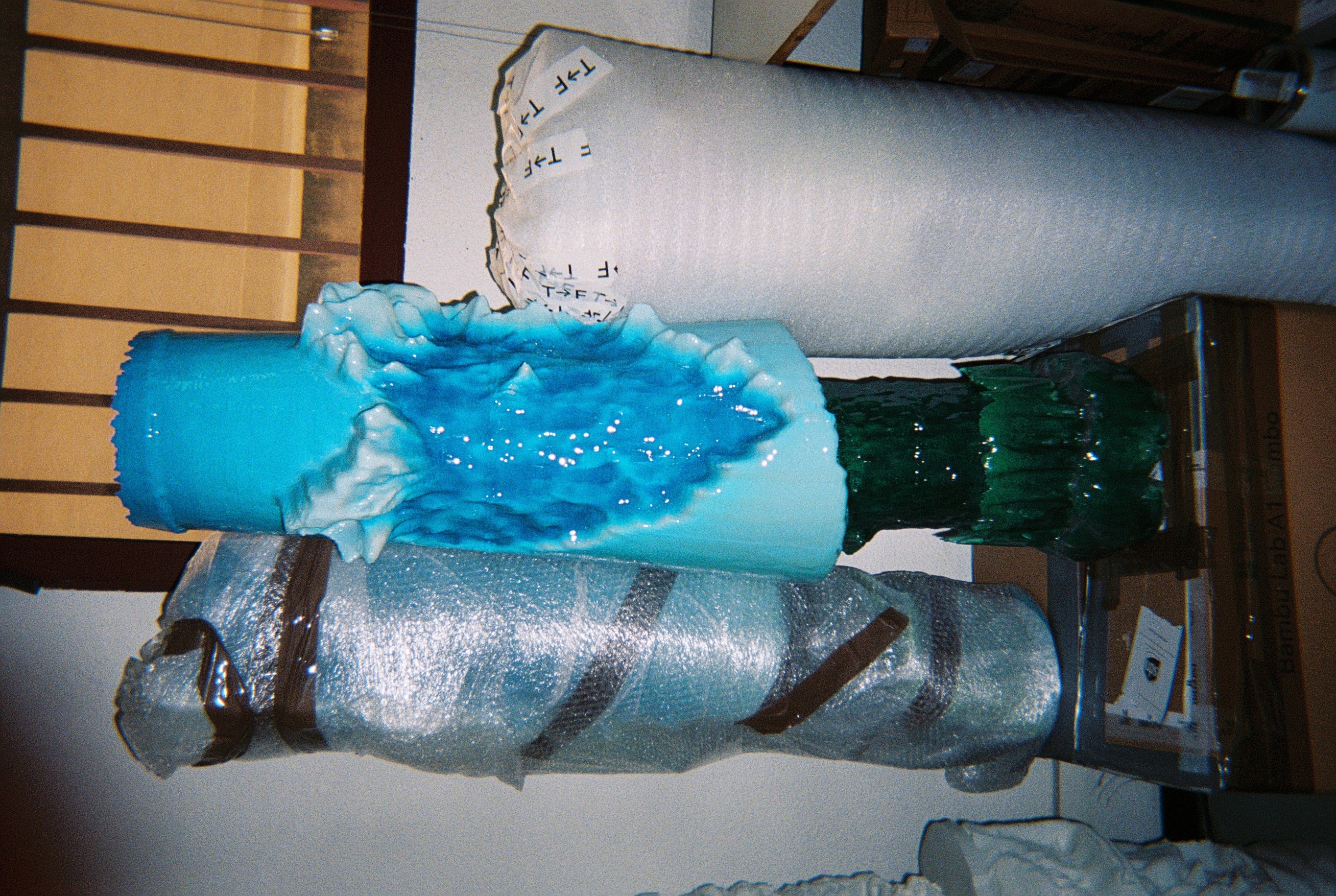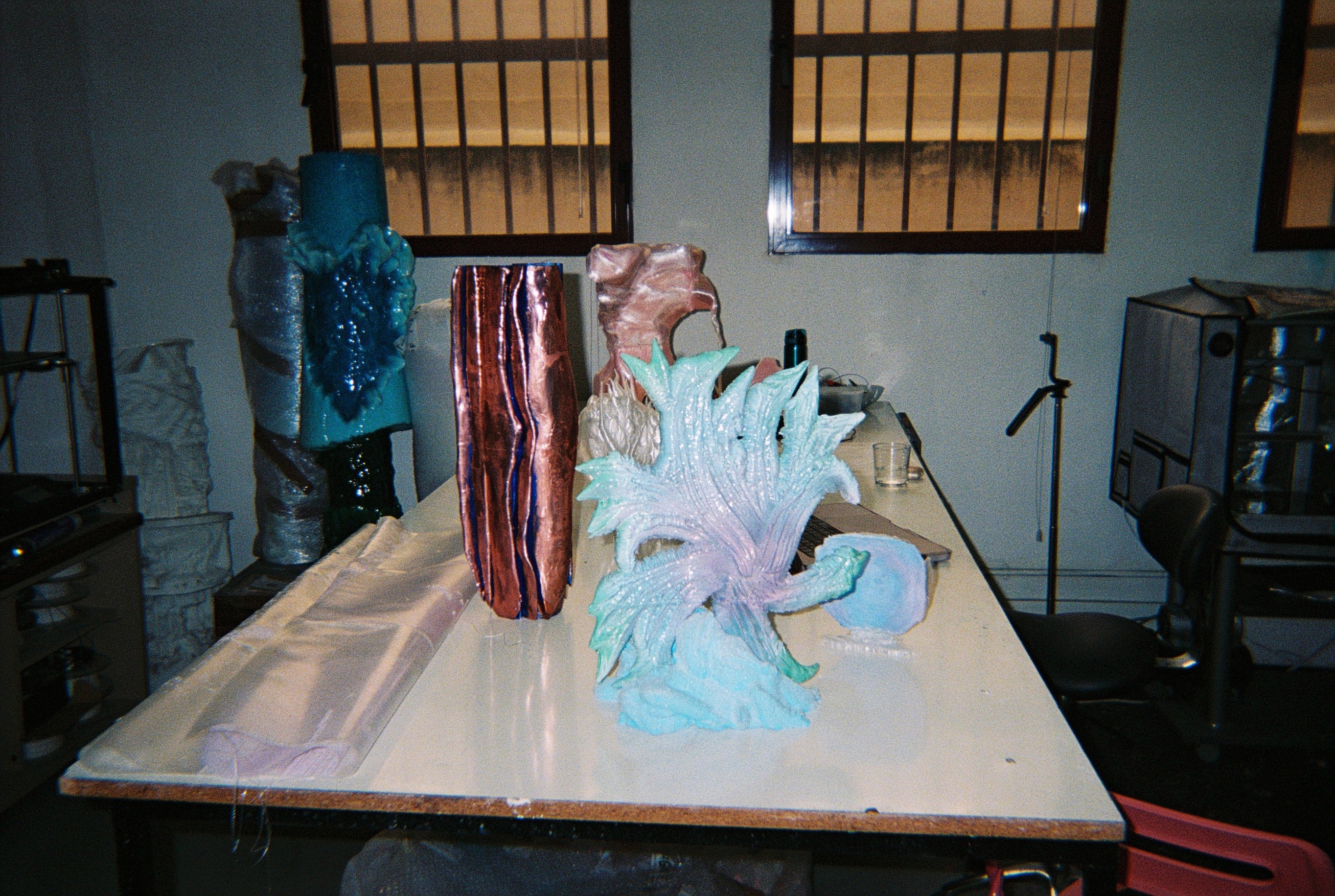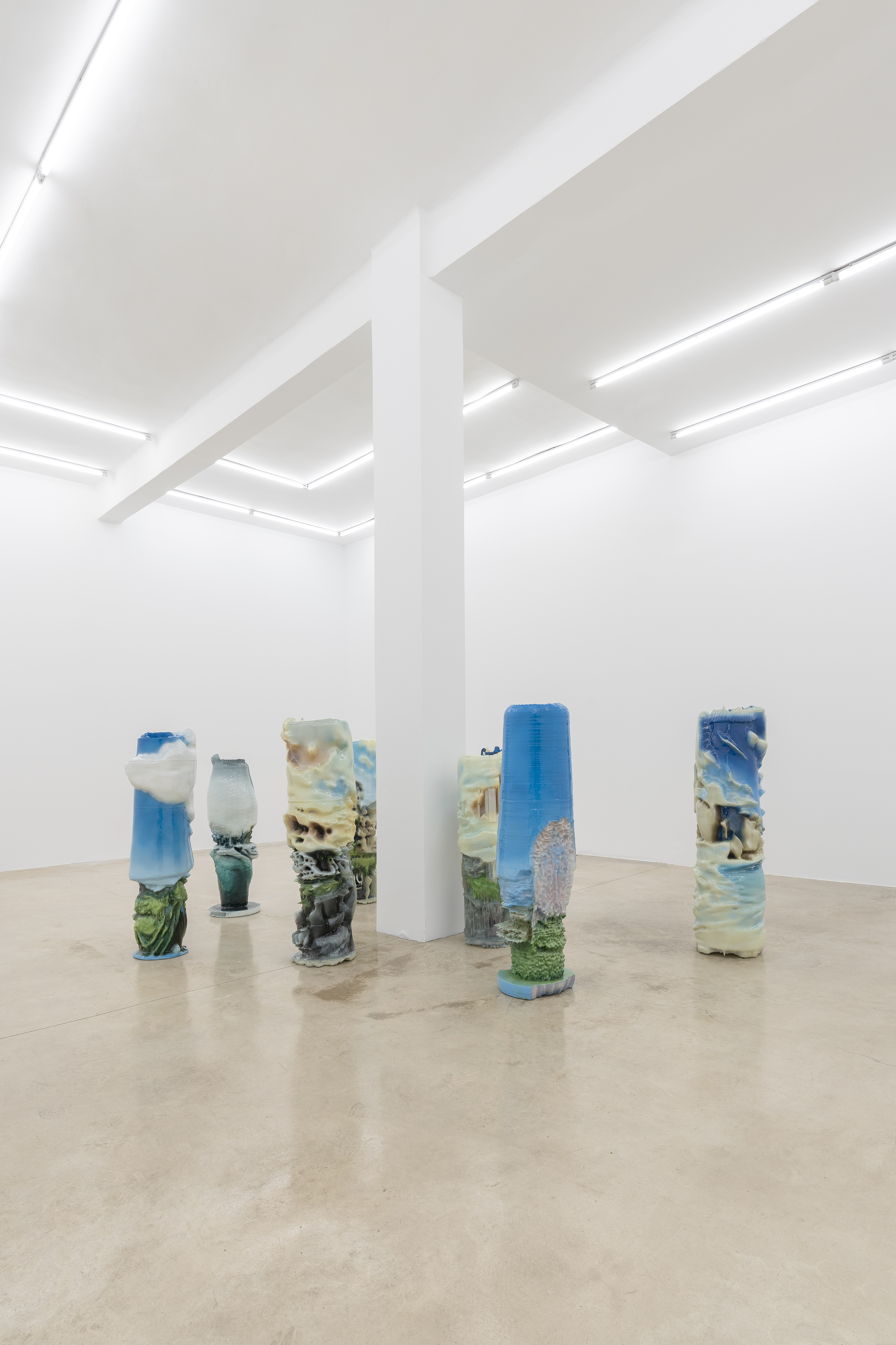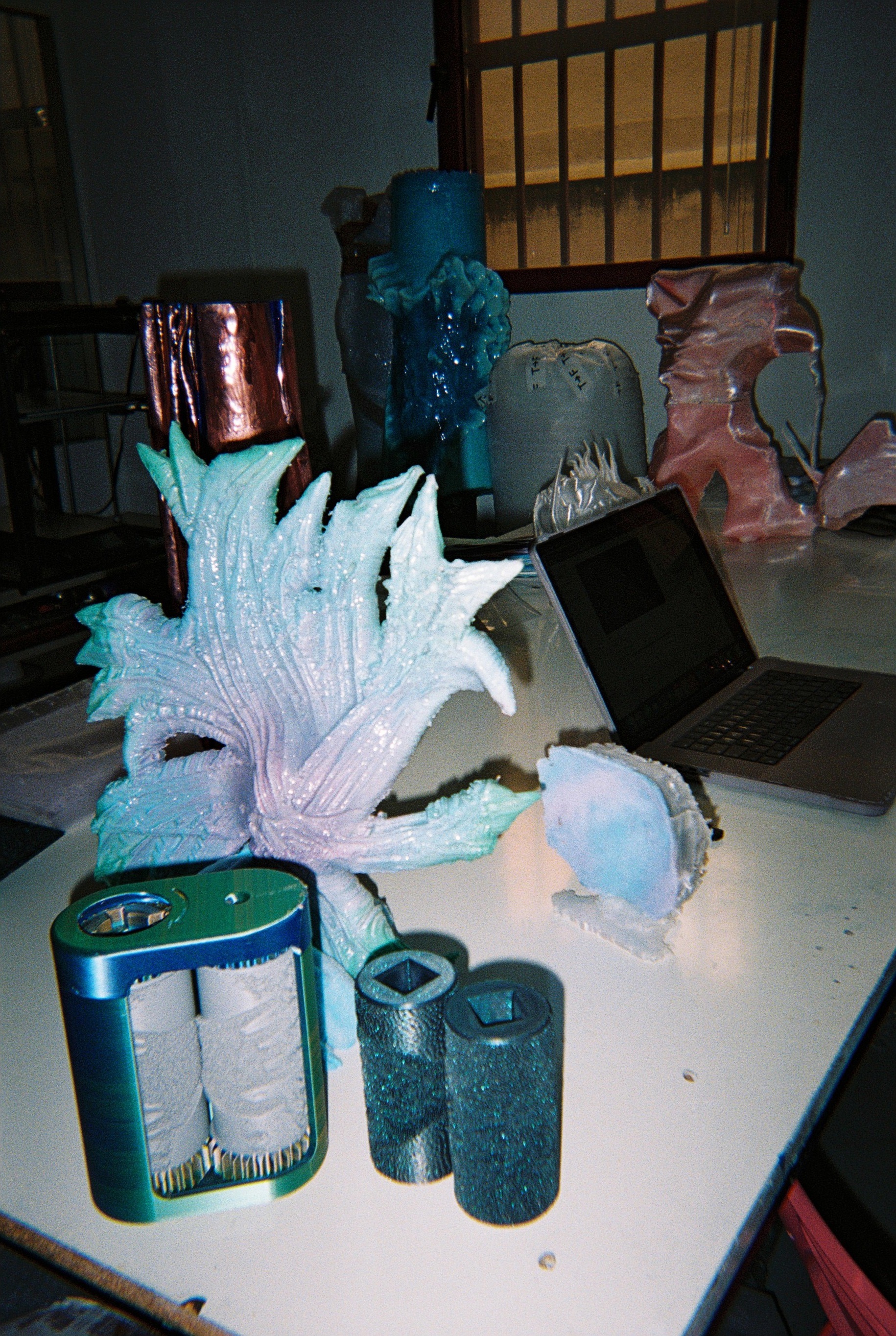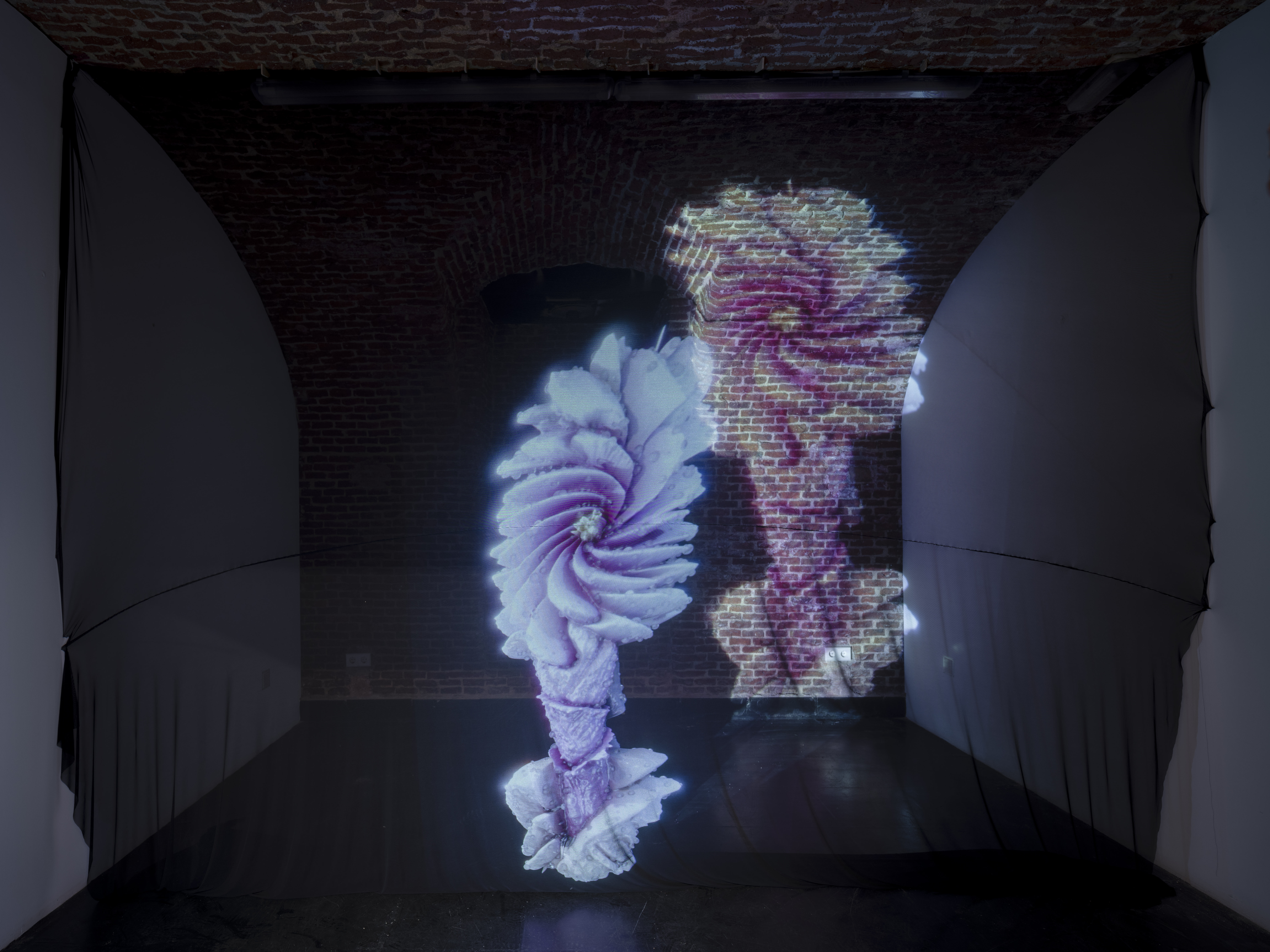 In my first solo exhibition, for example, there was an installation with columns and two screens showing an animation. The same form appearing in the video was also present physically in the space. It was an organic shape, recognizable yet not, with those imperfect finishes that interested me a lot at the time. AI was advancing quickly, but then I was very drawn to errors, to the amorphous, to the undefined. Today it can be visually much more precise, but at that moment those flaws were part of the aesthetic that interested me.